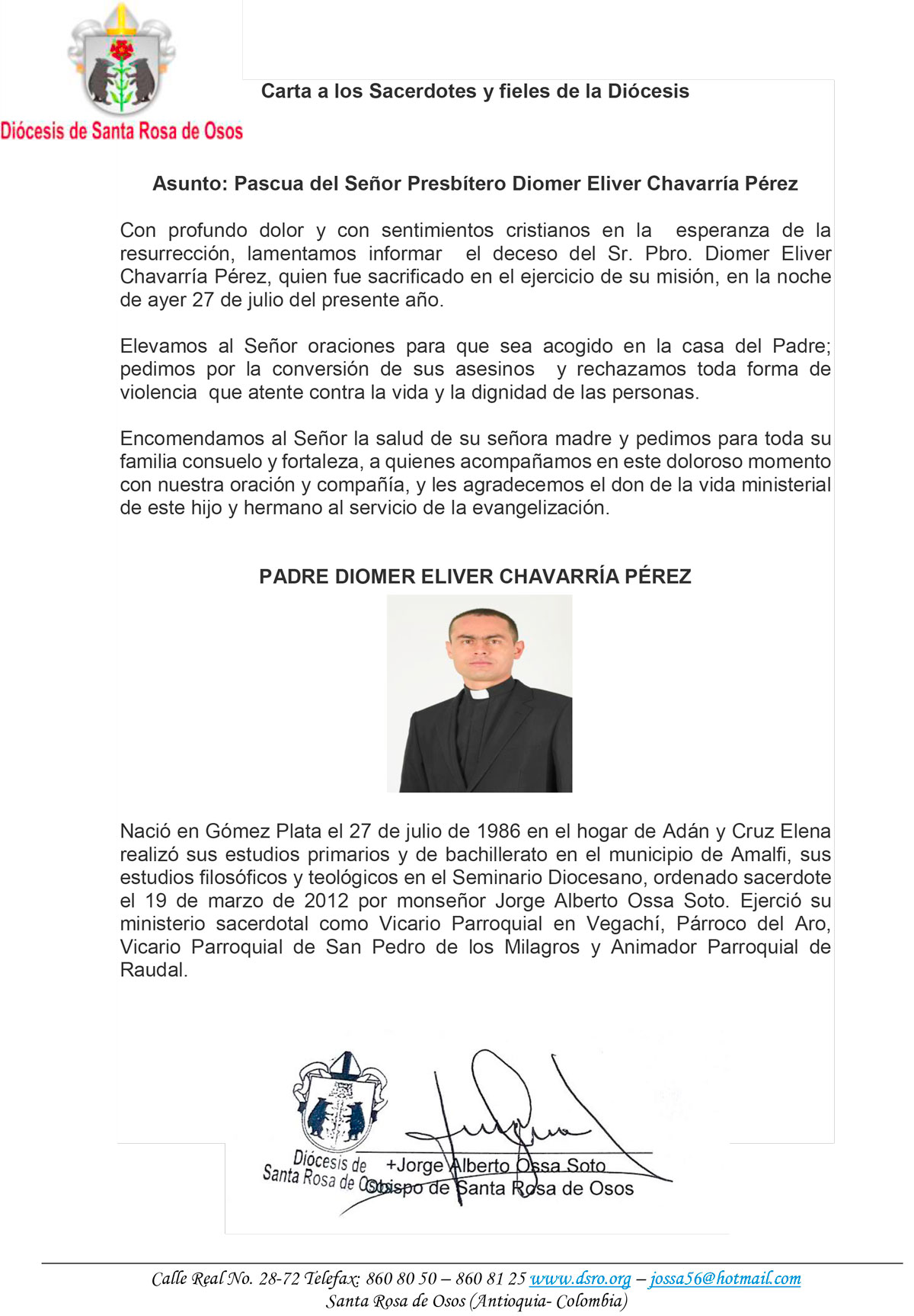 Compartimos el comunicado emitido por monseñor Jorge Alberto Ossa Soto, obispo de la diócesis de Santa Rosa de Osos, a la cual pertenecía el sacerdote asesinado.